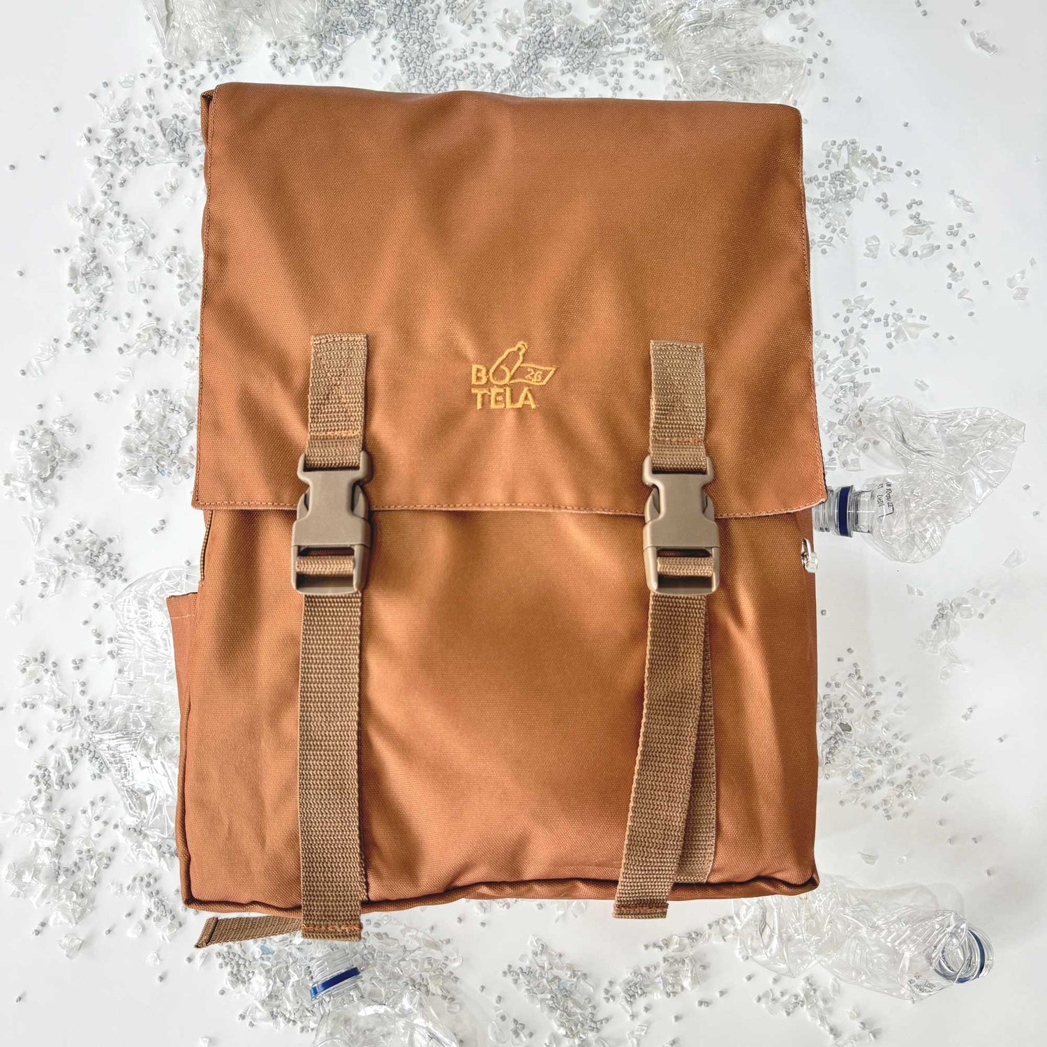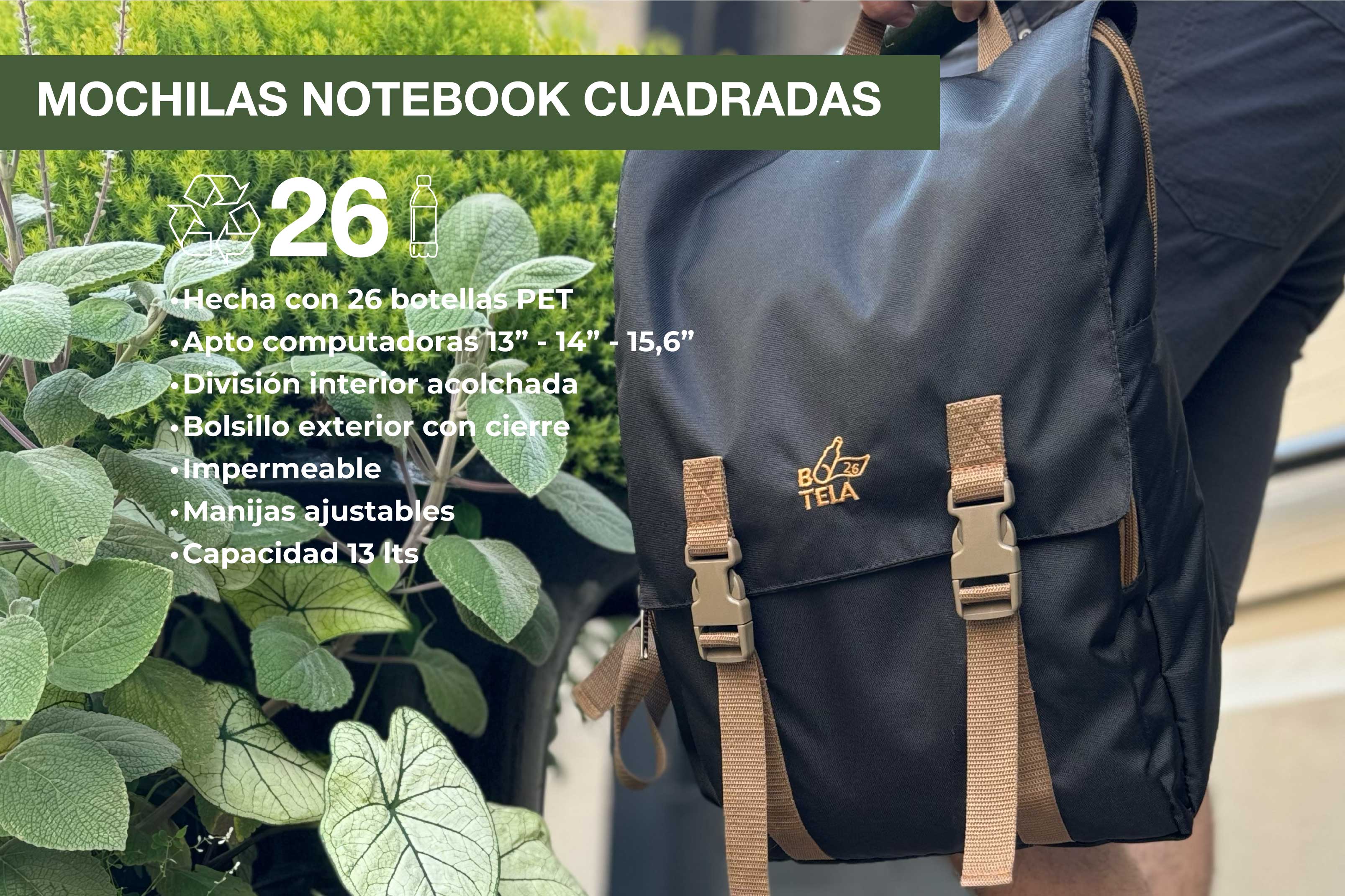 Mochilas hechas con telas a partir de botellas plásticas recicladas, comprometidas con la reducción de residuos y un impacto positivo en el medio ambiente.